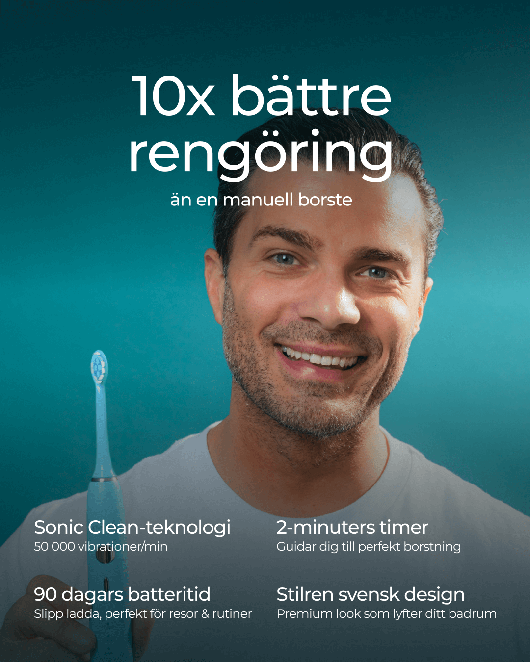 Vår tandborste ger en unikt ren känsla efter att du borstat med den, tack vare dess 50 000 vibrationer per minut. Den har hela 90 dagars batteritid, resefodral och tre borsthuvuden, samt en timer som hjälper dig att borsta rätt.