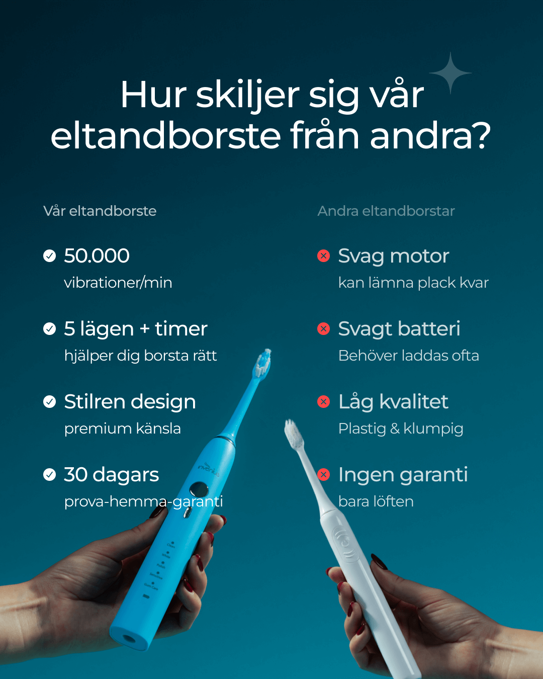 Vi är företaget med kvalitetsprodukter inom munhälsa som tar ett helhetsansvar för ditt välbefinnande. Det är därför vi kan utlova en garanti att du kommer bli nöjd. Vi säljer marknadens bästa elektriska tandborste, tandremsor och tandkräm.